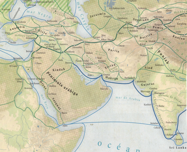 葡萄牙人Desperta Ferro在其2020年发表的《马可波罗与丝绸之路》(Marco Polo y la Ruta de la Seda)一书中,附有一幅马可波罗行程示意图,较为清晰。图中显示,他是从安纳托利亚地区出发,穿越西里西亚(Cilicia)、沿幼发拉底河右岸东行,绕过巴格达城,走巴格达至巴达哈伤大路,过帕米尔,抵达喀什。