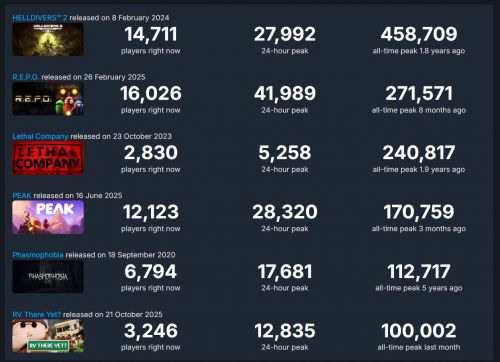 放眼过去,玩家对多人合作和微恐类产品的印象,还停留在Steam平台游戏。但细数近年来大家印象较深的爆款,诸如《地狱潜者2》《致命公司》《R.E.P.O》《恐鬼症》,以及今年发售的《Peak》《RV There Yet?》……Steam同时在线峰值不过十几万,最高也只有27万。