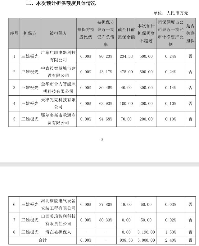 截至公告披露日,上述担保项下仍处于担保期间的余额为938.53万元,占三雄极光最近一期经审计净资产的0.46%。