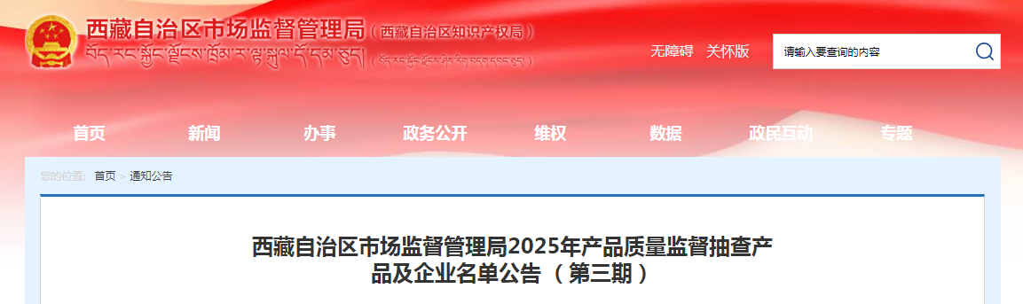 中国质量新闻网讯 据西藏自治区市场监督管理局网站消息,根据《中华人民共和国产品质量法》规定,2025年西藏自治区市场监督管理局组织开展了工业产品质量监督抽查,现将抽查产品及企业名单予以公告(第三期)。
