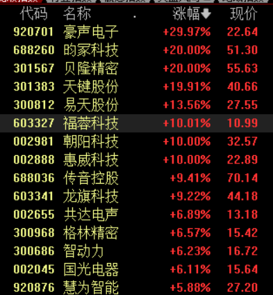 具体来看,消费电子板块集体爆发,AI手机方向领涨,中兴通讯、朝阳科技、福蓉科技(维权)等多股涨停。