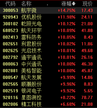 商业航天概念延续强势,雷科防务、通宇通讯、利君股份、航天发展等10股涨停。