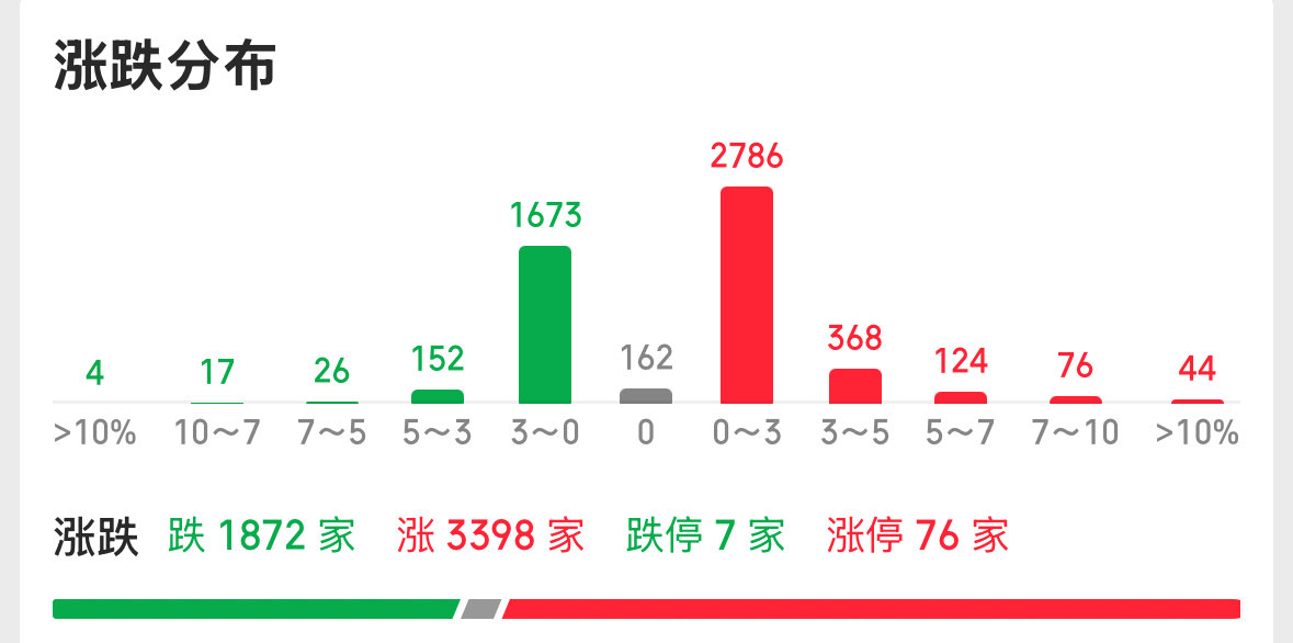个股走势与指数修复性反弹形成呼应,不少股民直呼“赚钱了”。全市场超3300只个股实现上涨,其中2786只个股涨幅集中在0—3%区间,平稳上涨成为市场主流;涨停个股数量同样亮眼,共计76只个股封住涨停板。