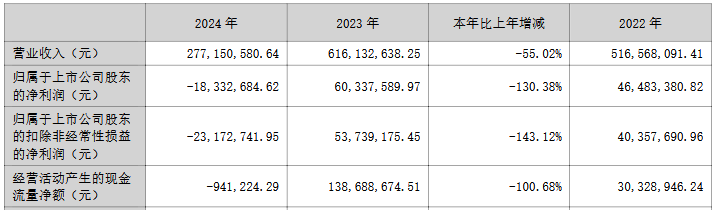 2024年,公司实现营业收入2.77亿元,同比下降55.02%;归属于上市公司股东的净利润为-1,833.27万元,上年同期为6,033.76万元;归属于上市公司股东的扣除非经常性损益的净利润为-2,317.27万元,上年同期为5,373.92万元;经营活动产生的现金流量净额为-94.12万元,上年同期为13,868.87万元。