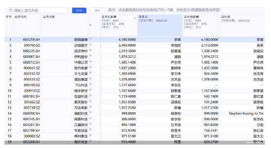经同花顺iFinD统计,在可显示2024年董事长薪酬的约4500家A股上市公司中,丁彦辉2024年435.56万元的年薪位列第135位。而从上述约4500家上市公司整体来看,2024年,药明康德董事长李革年薪达到4180万元,稳坐头把交椅。