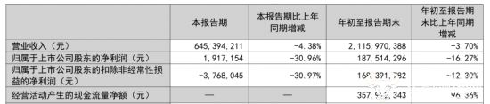 财报数据显示,张裕今年前三季度营业收入为21.16亿元,同比下降3.70%,归母净利润为1.88亿元,同比下降16.27%。其中,第三季度营收同比下降4.38%至6.45亿元,归母净利润为191.72万元,同比下降30.96%,营收和利润双双下降,未能改善公司的盈利情况。