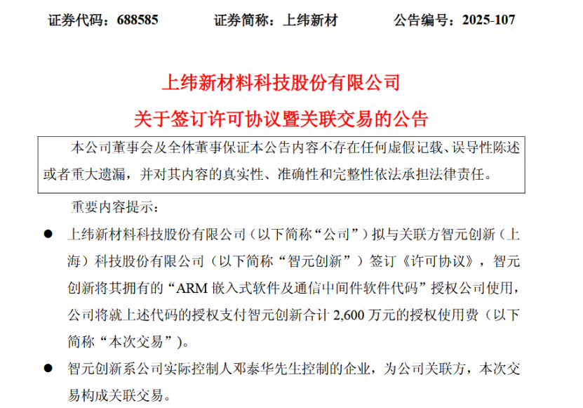 《科创板日报》12月5日讯(记者 吴旭光)今日(12月5日)晚间,上纬新材(688585.SH)公告称,拟与关联方智元创新签订《许可协议》,智元创新将其拥有的“ARM嵌入式软件及通信中间件软件代码”授权公司使用,公司将支付智元创新合计2600万元的授权使用费。该交易构成关联交易,但不构成重大资产重组。