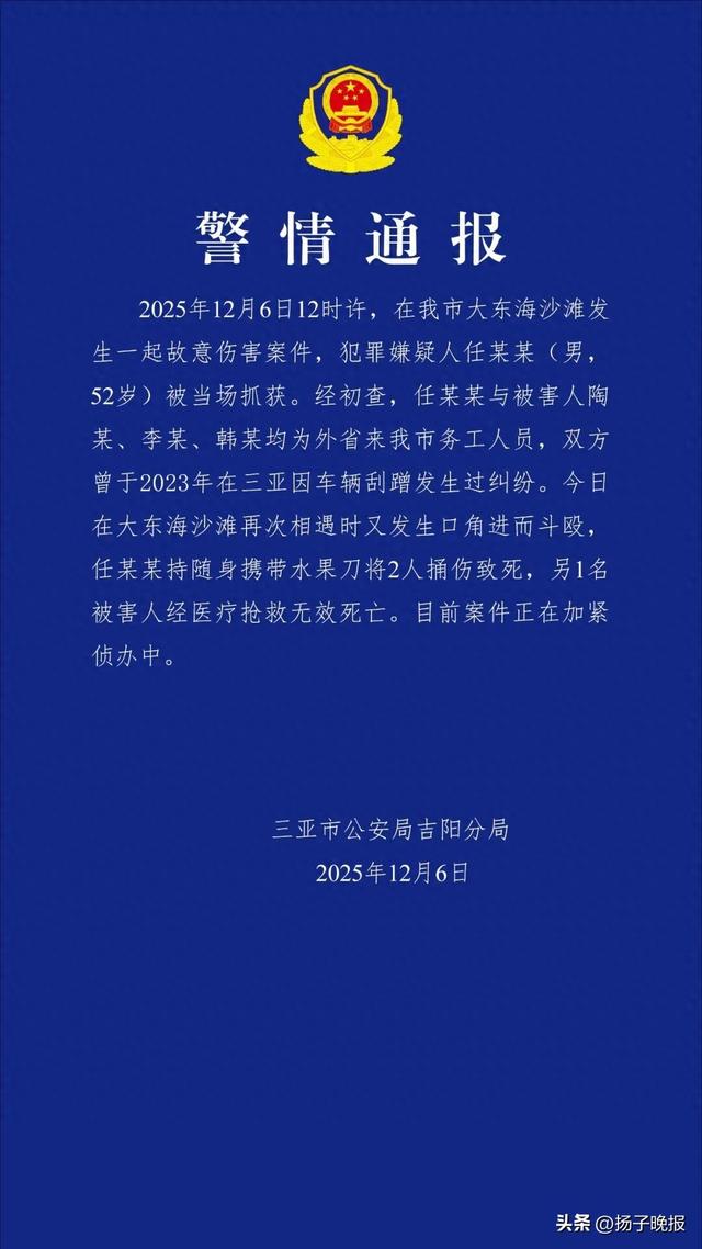 2025年12月6日12时许,在我市大东海沙滩发生一起故意伤害案件,犯罪嫌疑人任某某(男,52岁)被当场抓获。