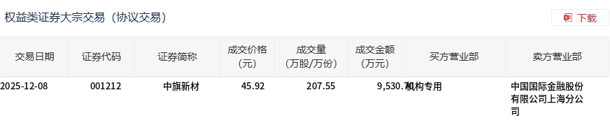 中旗新材今日大宗交易平价成交207.55万股,成交额9530.7万元