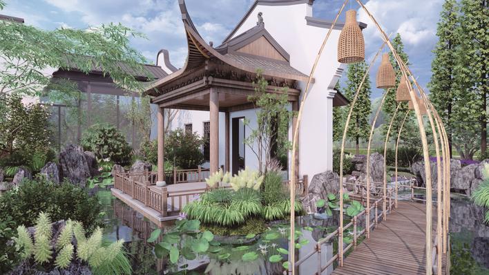 生态设计尤为突出。团队注重与自然环境的和谐共生,选用木材等绿色可再生材料,打造低碳可持续的景观园林。即便条件有限,仍通过布局巧妙保留525.6平方米的水域。水池以圆拱桥亭为界,分隔芦苇滩与主水面,搭配垂柳、荷花,再现水墨画境的虚实相生。