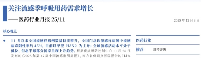 【环球网财经综合报道】国家流感中心发布的中国流感监测周报显示,2025年11月24日至11月30日,我国流感活动继续上升;并预测今年秋冬流感高峰可能出现在12月中下旬至明年1月初,市场对抗病毒药物及对症治疗药物的需求大幅增长,特别是儿童作为流感易感人群,用药需求尤为迫切。