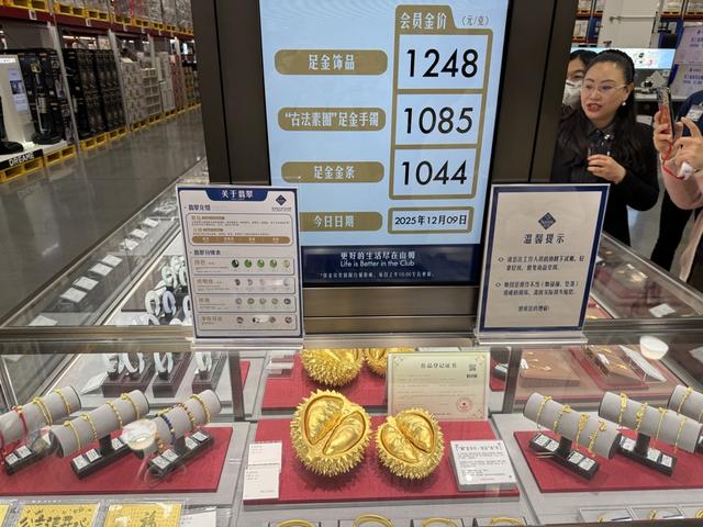 在金饰区,电子屏正实时更新着山姆的当天会员金价。只见足金饰品1248元/克、古法素圈手镯1085元/克、足金金条1044元/克,另外,好几款大克重的热门手镯,记者发现工费仅35元/克,无论单价还是工费都比当天的品牌金店低。