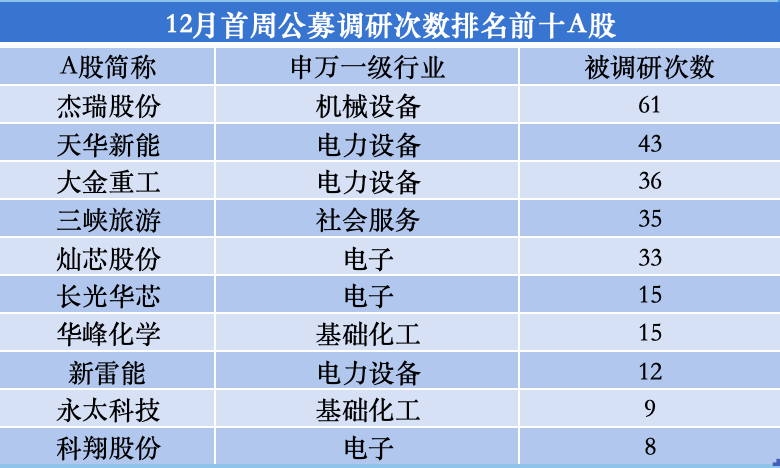 从行业分布来看,12月首周公募调研次数排名前十的个股主要集中在电力设备、电子和基础化工三大行业。其中,电力设备行业共有3只个股进入前十,分别是天华新能(300390)、大金重工(002487)和新雷能(300593),调研频次依次为43次、36次和12次,其中天华新能与大金重工包揽了第二和第三位。