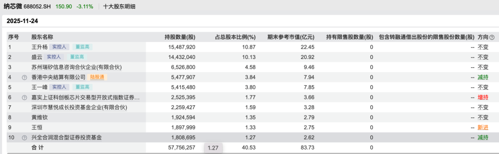 另据纳芯微(688052)11月28日披露的前十名股东持股情况,截至11月24日,兴证全球基金知名基金经理谢治宇管理的兴全合润再次减持了61.90万股。今年二季度至三季度期间,该基金也分别减持了110.57万股、4.80万股。