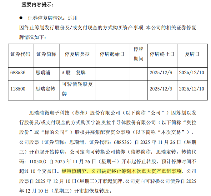 12月9日晚,模拟芯片龙头思瑞浦(688536.SH)发布公告:公司宣布终止筹划以发行股份及/或支付现金的方式购买宁波奥拉半导体股份有限公司(下称“奥拉股份”)股权的重大资产重组事项。