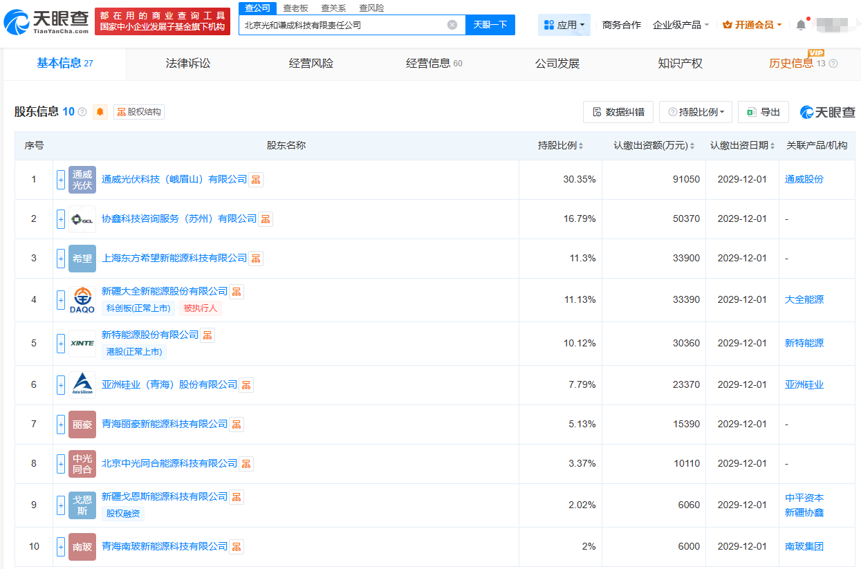 据天眼查股东信息显示,通威股份(600438.SH)控股孙公司通威光伏科技(峨眉山)有限公司持股30.35%,认缴注册资本为91050万元;协鑫科技(03800.HK)子公司协鑫科技咨询服务(苏州)有限公司持股16.79%,东方希望、大全能源(688303.SH)、新特能源(01799.HK)和亚洲硅业持股比例分别为11.3%、11.13%、10.12%和7.79%。