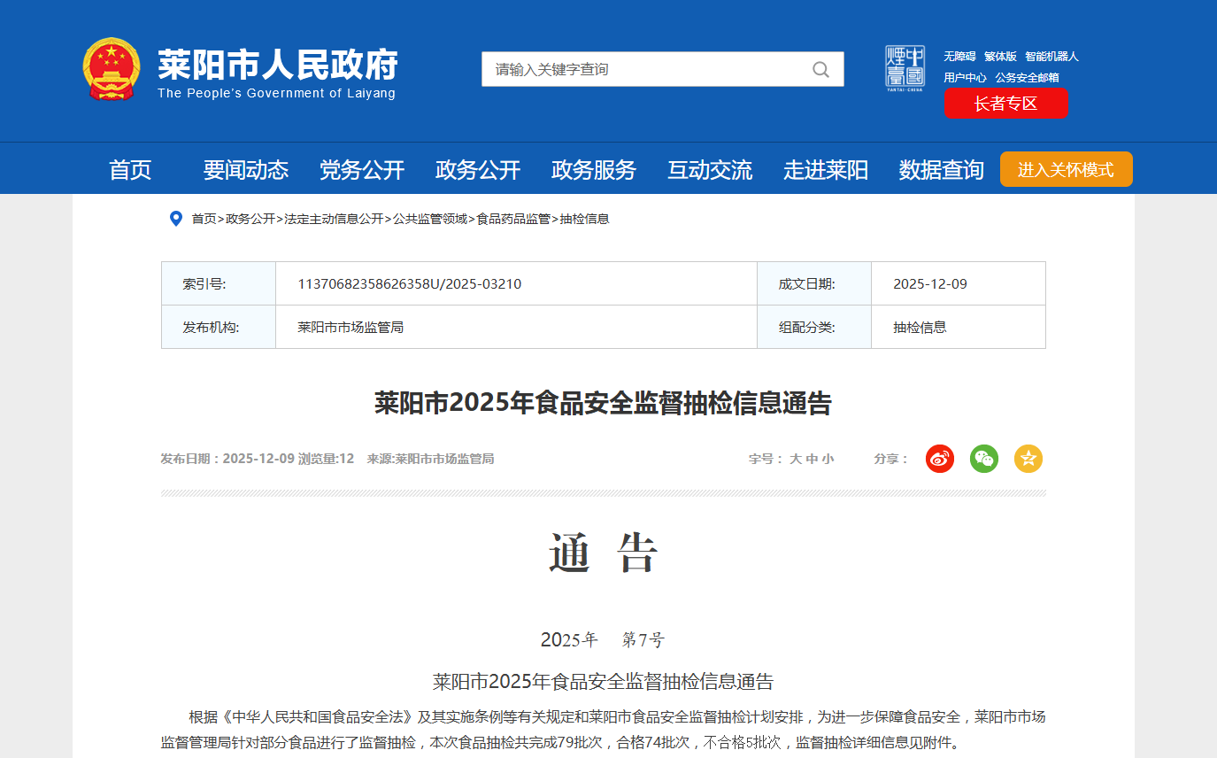 根据《中华人民共和国食品安全法》及其实施条例等有关规定和莱阳市食品安全监督抽检计划安排,为进一步保障食品安全,莱阳市市场监督管理局针对部分食品进行了监督抽检,本次食品抽检共完成79批次,合格74批次,不合格5批次,监督抽检详细信息见附件。