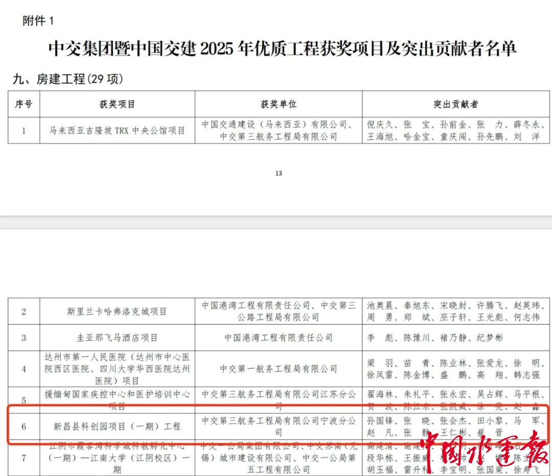近日,中交三航局四公司承建的新昌县科创园项目(一期)工程凭借卓越的工程品质、创新的技术应用和显著的社会价值,成功斩获“2025年度中国交建优质工程奖”。