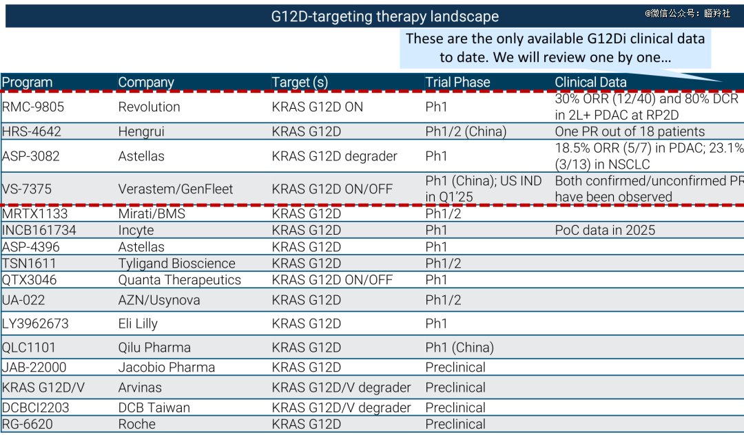 不仅G12C在卷,G12D的研发竞赛也在上演,包括恒瑞医药、Revolution、劲方/Verastam、Astellas等处于领 先位置,竞争卷度在接近G12C。