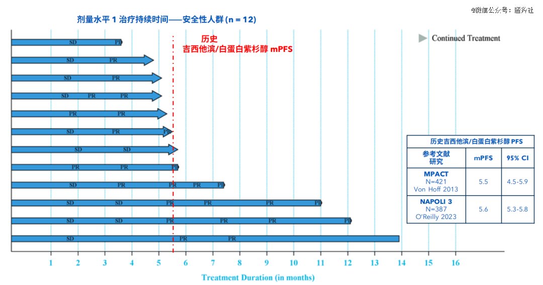 数据显示,在12名可评估的PDAC患者中,cORR为83.33,DCR为92%。从这个小样本临床的数据看,已经有入组早的患者随访到一年以上都在维持,也有部分患者PR维持9个月以上疾病才进展。无论如何,疗效已经明显优于白蛋白紫杉醇+吉西他滨的联合一线标准疗法。