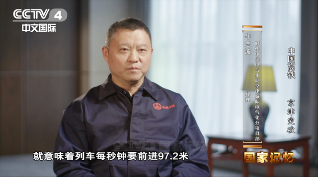 牛志波 时任中铁电气化局京津城际电气化分项目部经理:时速350公里就意味着列车每秒钟要前进97.2米,假如接触网误差比较大,就会造成受电弓短暂地脱离接触线,在分开的一刹那会产生很严重的电弧。