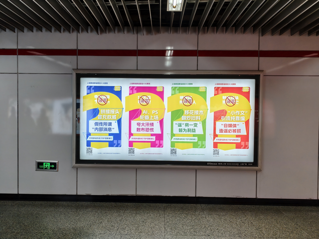 同步启动的五大城市地标公益灯箱展,则以“集群化、规模化”的展示形式形成宣传声势。在人民广场、新天地等流量密集区域,系列“大字报”风格海报整齐排列,通过简洁有力的文字、强烈对比的色彩,将网络谣言的危害与辟谣知识传递给过往市民,让公益宣传融入城市生活场景,扩大宣传面与影响力。