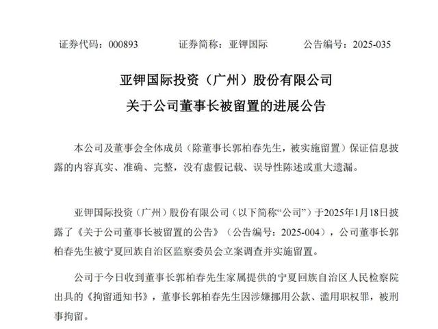 亚钾国际的多份公告还原了相关事件进展:2024年3月,公司披露郭柏春因在银川市副市长任内涉嫌渎职犯罪被留置;2025年1月、7月先后发布进展公告,披露其被立案调查及刑事拘留的消息;2025年8月19日,公司同步公告郭柏春被逮捕的信息,并多次强调相关事项系其个人行为,与公司无关联,公司生产经营正常,控制权未发生变化。此外,天娱数科也同期披露了其董事郭柏春被逮捕的相关公告。