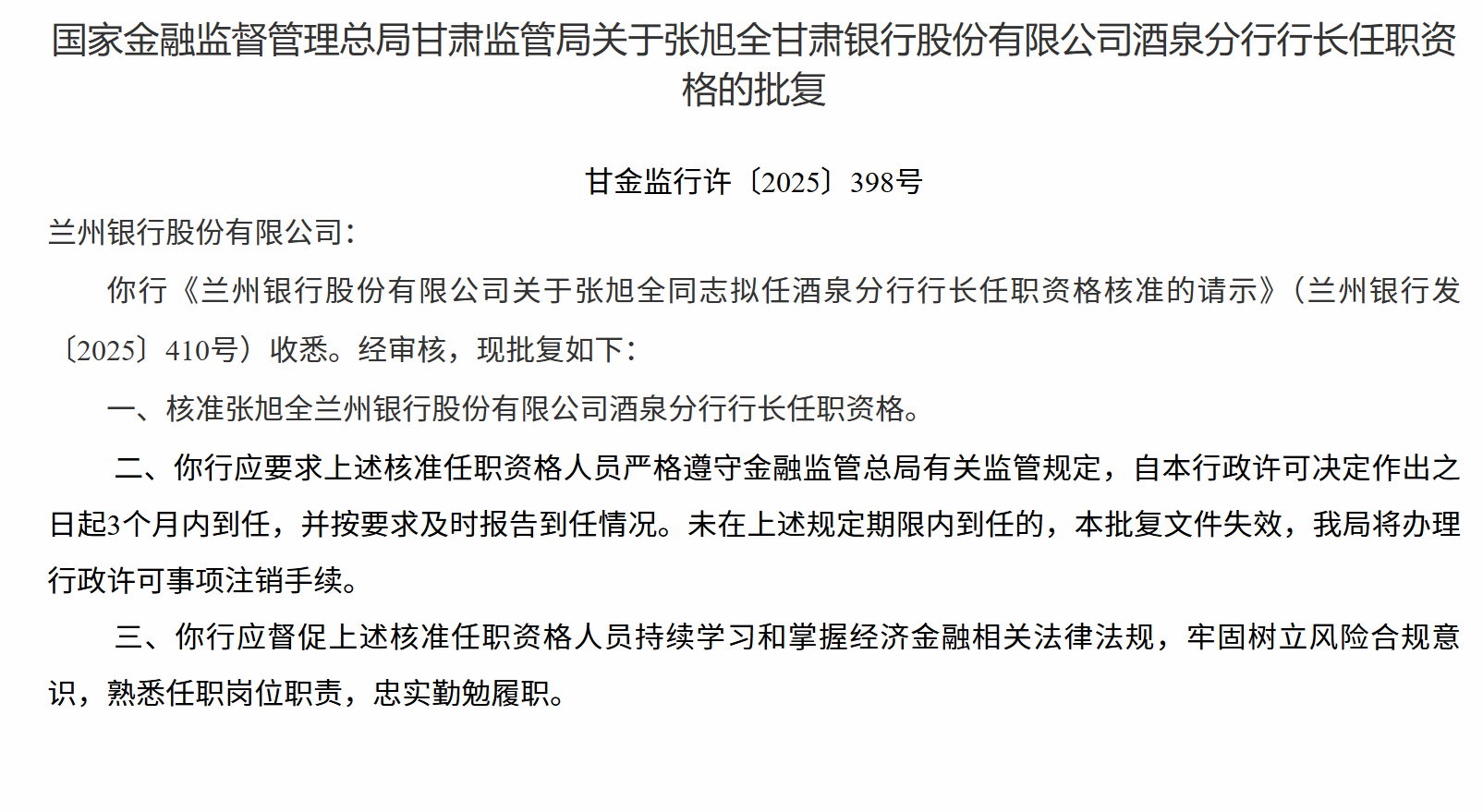 12月11日,国家金融监督管理总局甘肃监管局发布关于张旭全甘肃银行股份有限公司酒泉分行行长任职资格的批复,核准张旭全
