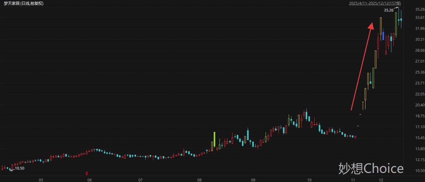 主营定制化木质家具的梦天家居11月18日公告称,公司决定终止筹划发行股份及支付现金购买上海川土微电子股份有限公司事项,同时实控人余静渊终止筹划控制权转让事项。停牌期间,公司就筹划发行股份及支付现金购买资产事项、实控人就筹划控制权变更事项进行了充分探讨,但由于涉及事项较多,经交易各方就核心条款经多次协商和谈判后,仍未达成共识,经慎重考虑并友好协商,各方决定终止筹划前述事项。梦天家居11月19日复牌一字涨停,此后更是录得5连板,拉长时间来看,其股价自11月低点迄今累计最大涨幅129%。梦天家居11月25日公告称,公司近期不存在任何控制权转让和任何资产重组的计划安排。前期权益变动涉及的股份协议转让尚需履行相关程序,相关权益转让事项是否最终完成仍存在不确定性。