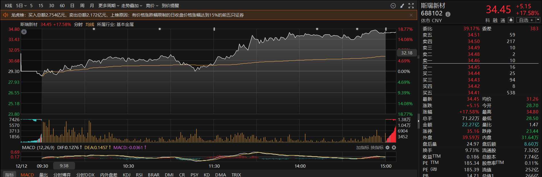 斯瑞新材周四发布机构调研纪要表示,公司火箭发动机推力室内壁产品,于2024年助力蓝箭航天朱雀三号VTVL-1可重复使用垂直起降回收试验箭十公里垂直起降飞行试验任务取得成功,九州云箭的液氧甲烷发动机完成10km级飞行的回收试验;于2025年上半年助力蓝箭航天朱雀三号可重复使用运载火箭一级动力系统试车成功。二级市场上,斯瑞新材周五收盘涨超17%。