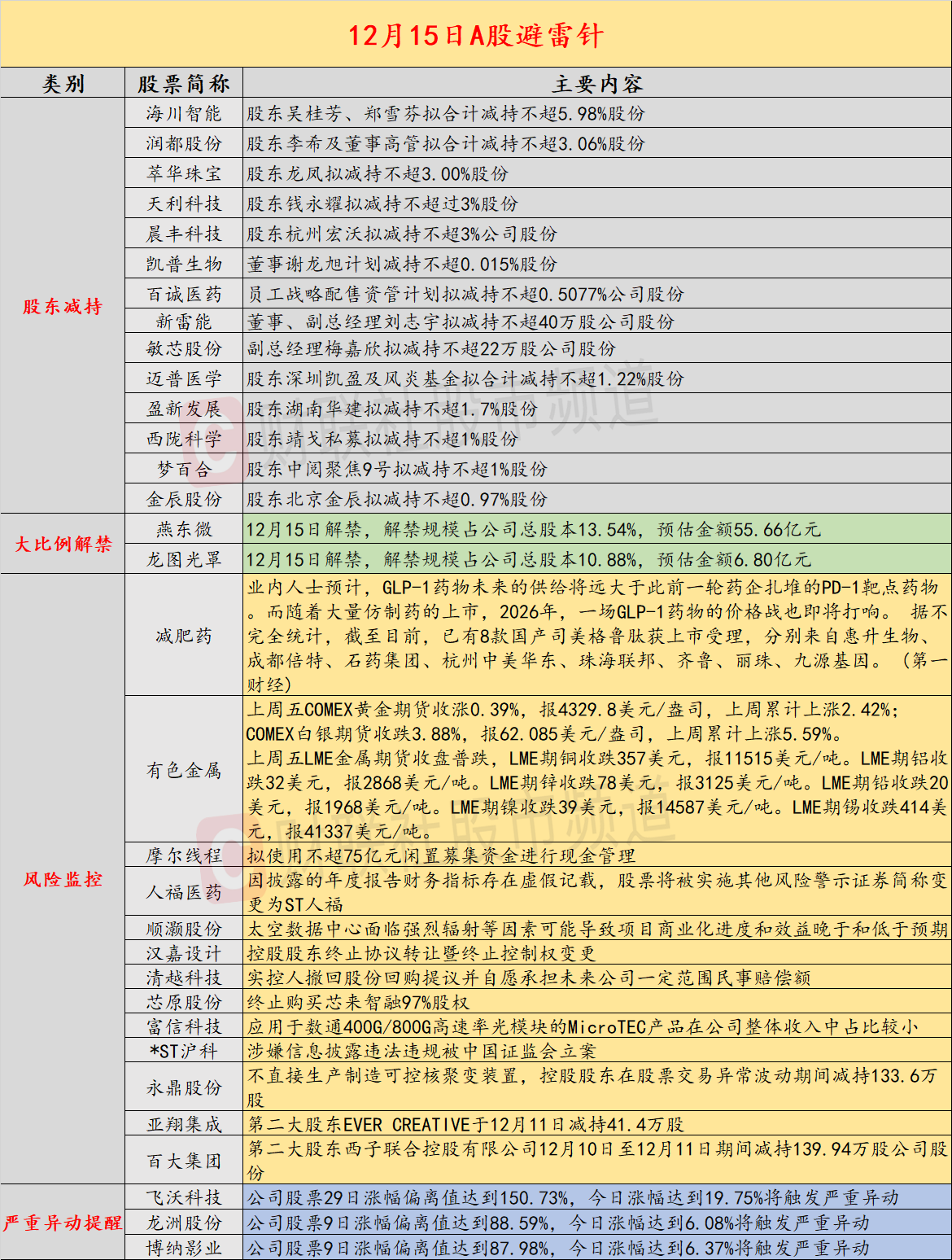 导读:财联社12月15日投资避雷针,近日,A股及海外市场潜在风险事件如下。国内经济信息方面包括:1)业内人士预计司美格鲁肽国内价格战即将打响;2)万科三个展期议案均未获通过;公司方面重点关注包括:1)摩尔线程拟使用不超75亿元闲置募集资金进行现金管理;2)人福医药因披露的年度报告财务指标存在虚假记载,股票将被实施其他风险警示证券简称变更为ST人福;海外市场重点关注包括:1)上周五美股三大指数集体收跌,博通跌超11%;2)上周五COMEX白银期货收跌3.88%。