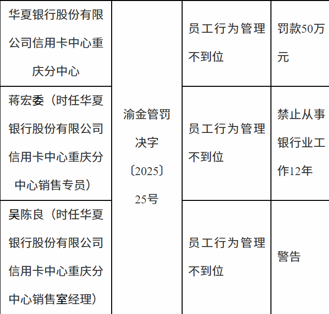 12月12日,国家金融监督管理总局重庆监管局行政处罚信息公开表显示,华夏银行股份有限公司信用卡中心重庆分中心因员工行为管理不到位被罚款50万元;蒋某委被禁止从事银行业工作12年;吴某良被警告。