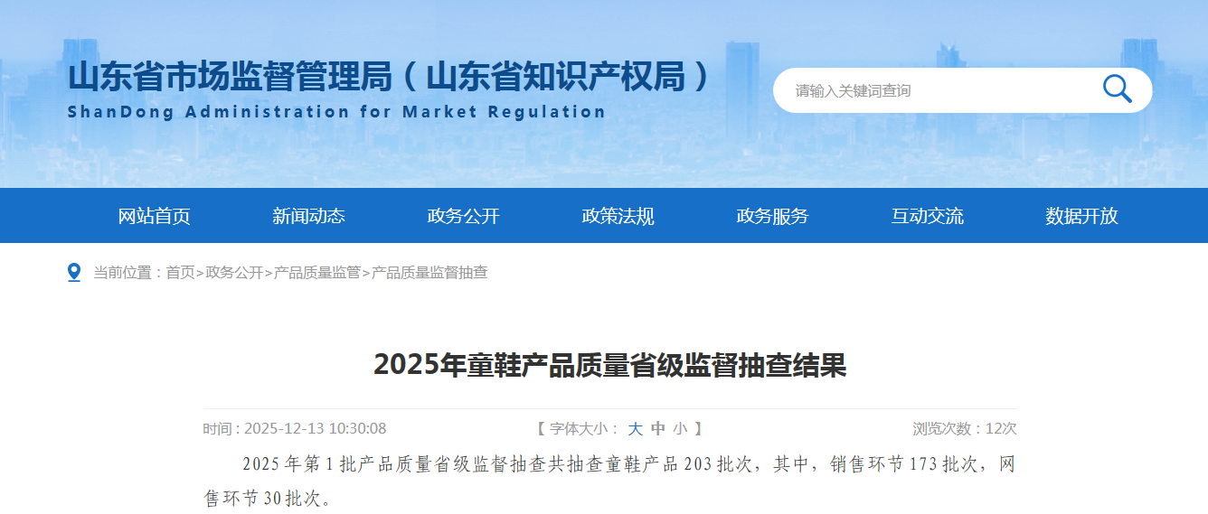 中国质量新闻网讯 据山东省市场监督管理局网站消息,近日,山东省市场监督管理局公布2025年童鞋产品质量省级监督抽查结果。2025年第1批产品质量省级监督抽查共抽查童鞋产品203批次,其中,销售环节173批次,网售环节30批次。