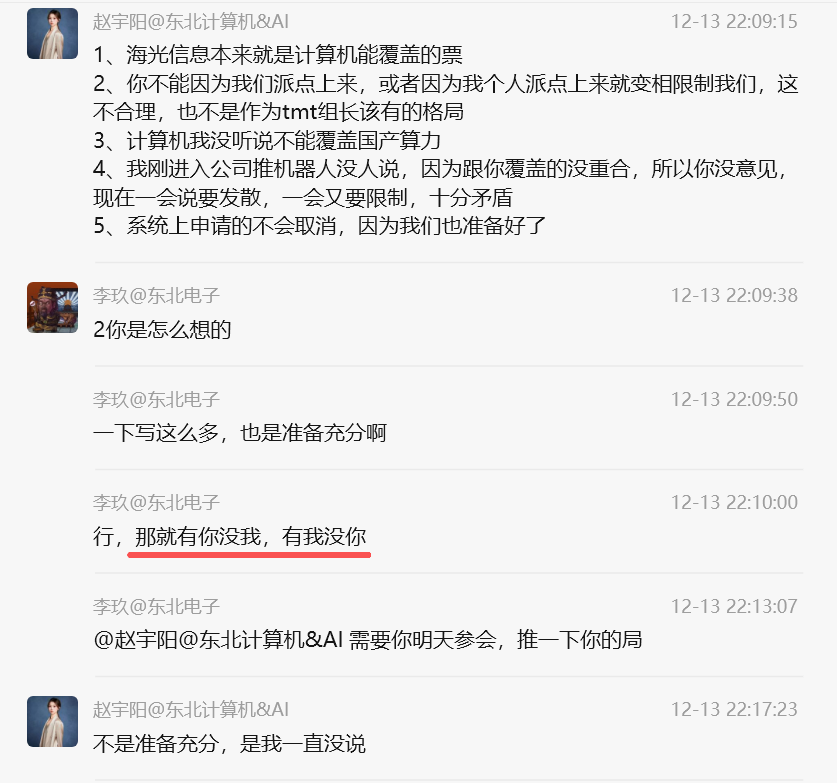 这一要求直接引发赵宇阳的强烈反对,她当场列出五条反驳理由:“1、海光信息本来就是计算机能覆盖的票;2、你不能因为我们派点上来,或者因为我个人派点上来就变相限制我们,这不合理,也不是作为TMT组长该有的格局;3、计算机我没听说不能覆盖国产算力;4、我刚进入公司推机器人没人说,因为跟你覆盖的没重合,所以你没意见,现在一会说要发散,一会又要限制,十分矛盾;5、系统上申请的不会取消,因为我们也准备好了。”