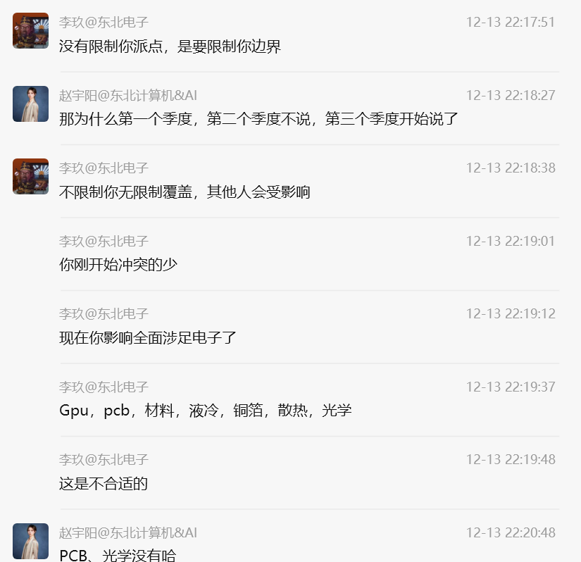 对此,李玖态度强硬,质疑赵宇阳“所谓的准备充分”,并扬言“有你没我,有我没你”。他强调,“没有限制你派点,要限制你边界”,并解释此前未提及边界问题,是因为“现在你全面涉足电子了,GPU、PCB等等”,认为对方研究范围已超出计算机行业范畴,侵入TMT领域的核心覆盖范围。