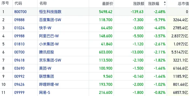 盘面上,今日大型科网股集体下跌拖累大市,百度大跌近6%表现最弱,阿里巴巴跌3.57%,小米、腾讯跌超2%,京东跌1.8%,美团跌1.46%。