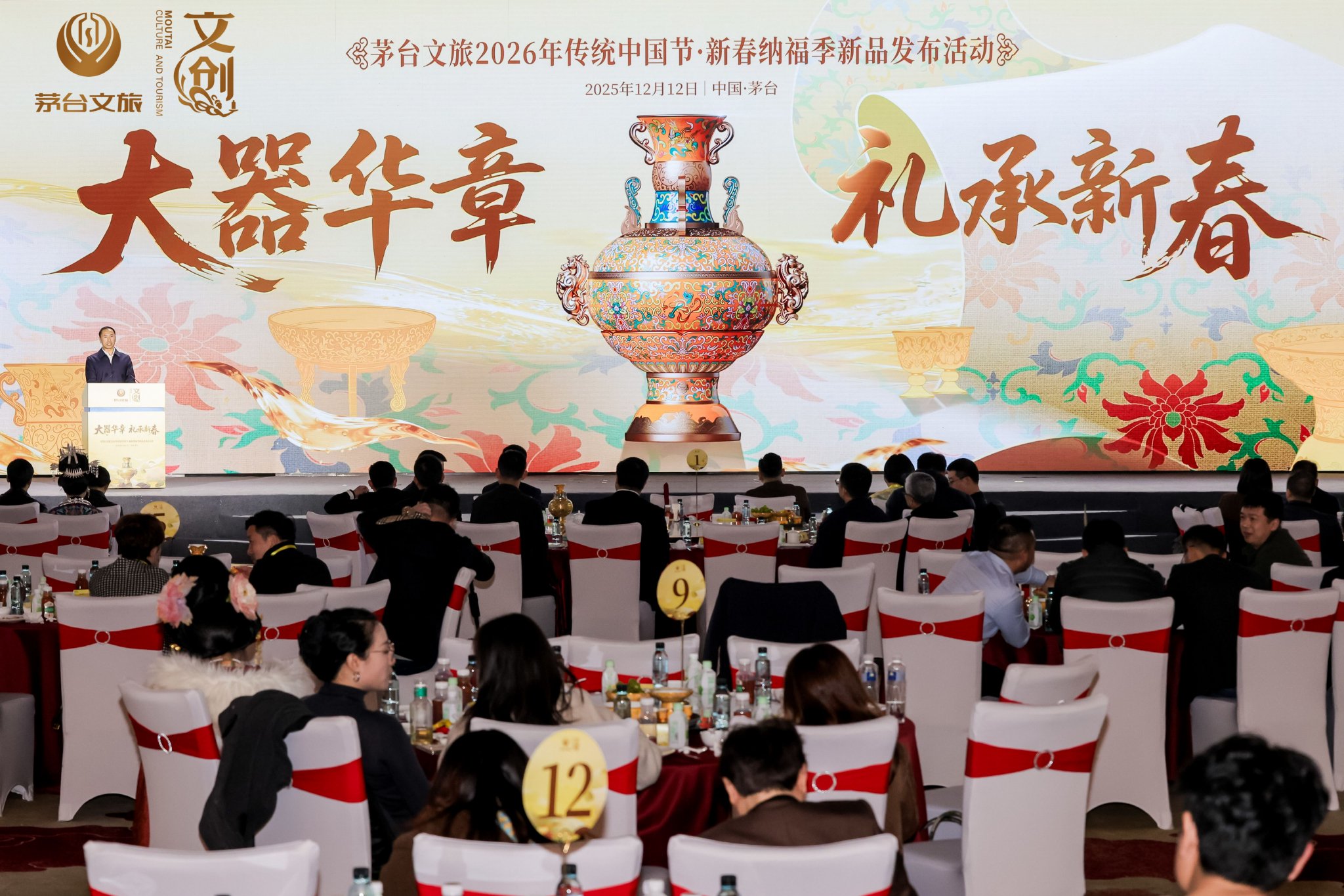 2025年12月12日,贵州茅台镇以“大器华章·礼承新春”为主题,正式发布了茅台酒厂(集团)文化旅游有限责任公司(茅台文旅)2026年传统中国节·新春纳福季新品——“福寿万疆大尊瓶”。该产品融合茅台酒传统酿造技艺与景泰蓝工艺两大国家级非物质文化遗产,标志着茅台文创在“双遗合璧”上迈出重要一步。