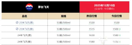 今日酒价数据显示,12月10日,25年53度/500ml原箱飞天茅台批发价报1520元/瓶,与昨日持平,而散瓶飞天茅台批发价下跌至1500元/瓶,较前一日下跌15元,价格再创年内新低,相较于年初2200元/瓶左右的价格,跌幅已超三成。