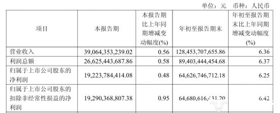 此外,茅台业绩的增速也有所放缓。财报数据显示,贵州茅台今年前三季度营业总收入为1309.04亿元,同比增长6.32%,归母净利润为646.26亿元,同比增长6.25%,增速已降低至个位数,但仍保持着业绩的增长趋势,继续稳居行业第一。