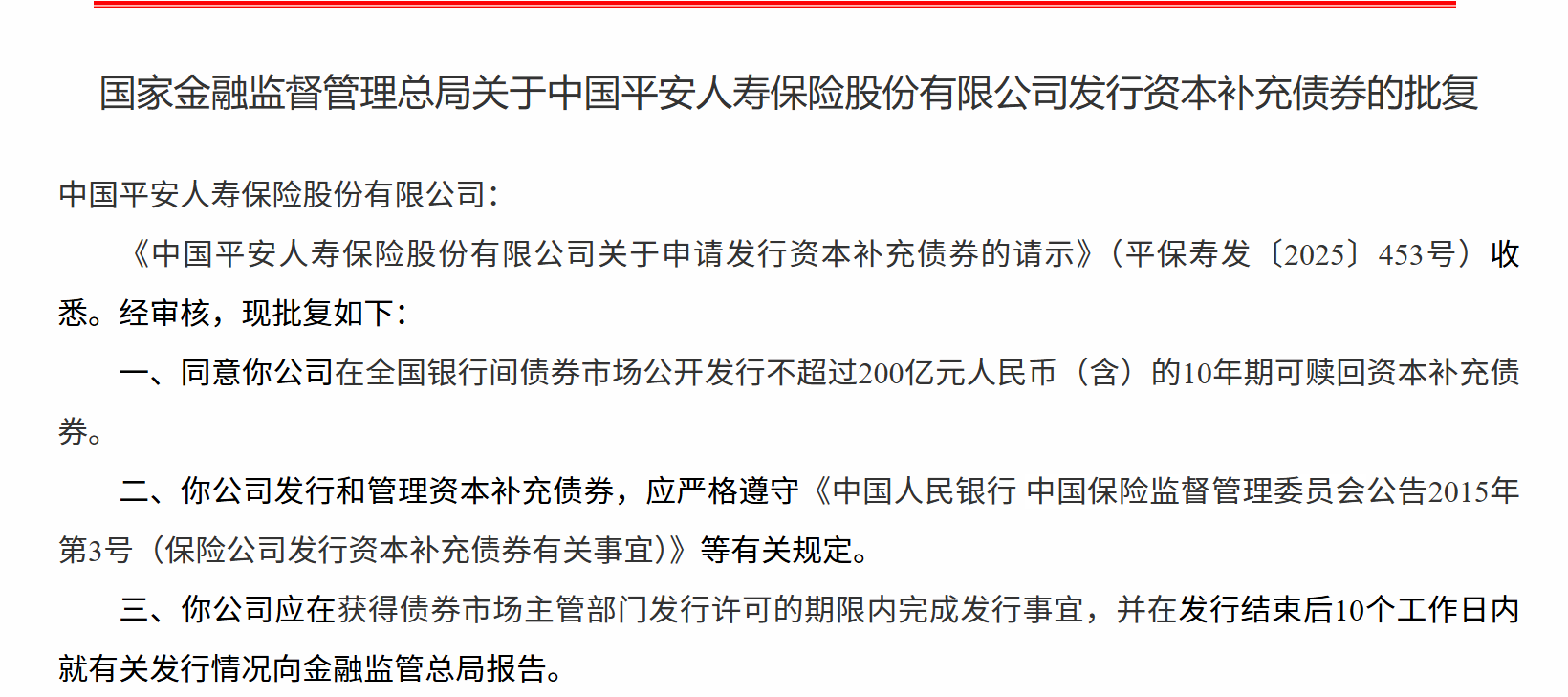 12月15日,国家金融监督管理总局发布关于中国平安人寿保险股份有限公司发行资本补充债券的批复,同意中国平安人寿保险股份有限公司在全国银行间债券市场公开发行不超过200亿元人民币(含)的10年期可赎回资本补充债券。