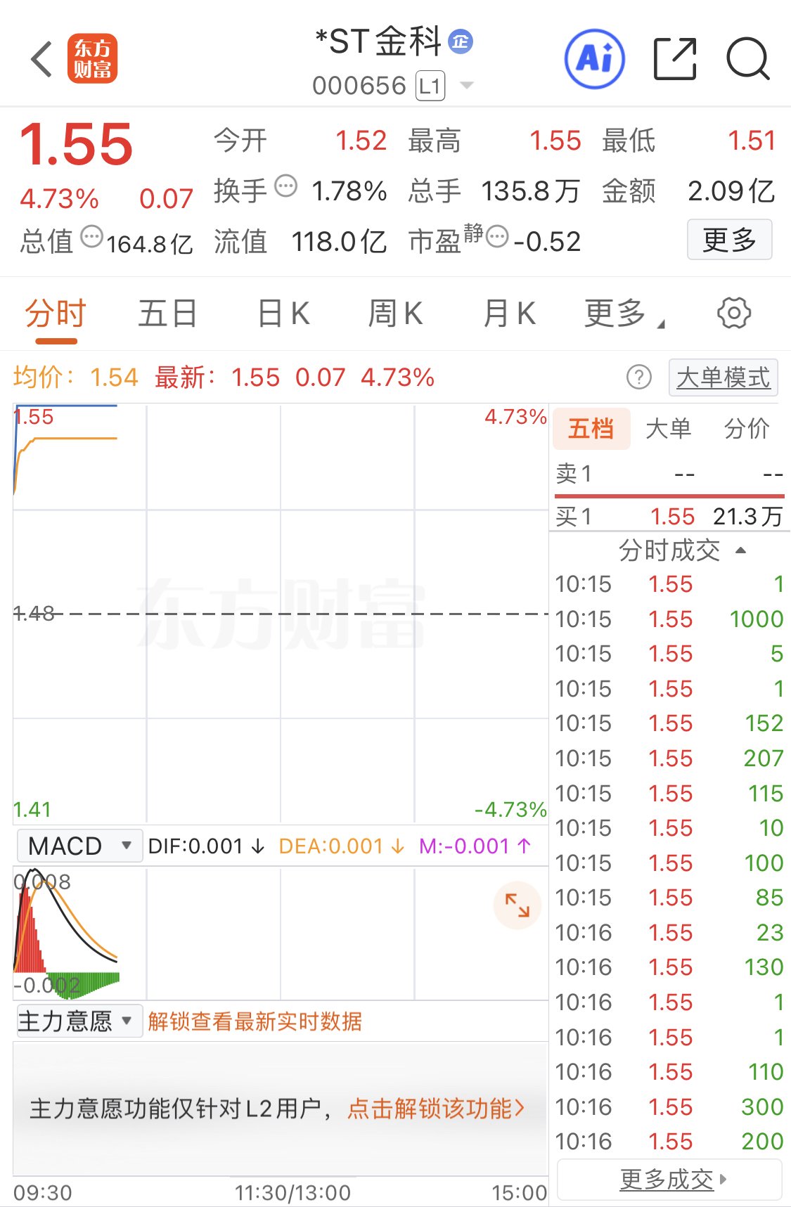 12月16日,*ST金科股价开盘大幅拉升,最终封于涨停,最新股价报1.55元/股,市值164.8亿元。12月12日、12月15日、12月16日,该个股股价已连续三个交易日持续上涨,累计涨幅6.16%。
