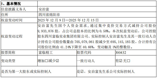 中国经济网北京12月16日讯富临精工(300432.SZ)昨晚披露关于控股股东、实际控制人及其一致行动人权益变动触及1%整数倍的公告称,公司于2025年11月17日披露了《关于实际控制人减持股份的预披露公告》,公司实际控制人安治富计划自上述公告披露之日起十五个交易日后的三个月内,以集中竞价交易方式减持公司股份累计不超过17,097,602股(占本公司总股本比例1.00%)。