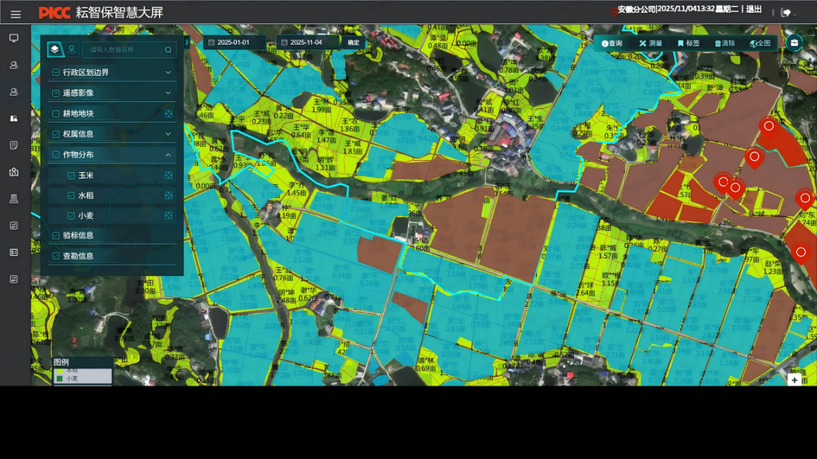 为推动农险承保理赔“双精准”工作,提高农险线上化、数智化水平,人保财险创新搭建农险GIS一张图系统,与“耘智保APP”相融合,实现基础数据、验标信息、作物信息、查勘信息等基于空间位置的落图管理(支持导入无人机航拍数据)。目前已完成遥感影像(亚米级)、行政区划、耕地地块、权属信息、作物分布、验标信息、查勘信息七个主题图层的开发上线,逐步实现“同一块地、多层属性、层层校验、层层精准”。同时“耘智保APP”农户端已在“中国人保财险”小程序的“农险服务”页面进行集成,投保农户可远程验标、查看保单、在线报案、远程查勘和查看案件进展。此次水稻收割期降雨指数保险便运用“无人机+耘智保APP”,实现了高效、精准验标理赔。