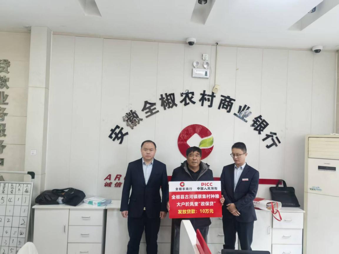 除了提供保险风险保障,人保财险安徽滁州市分公司还与全椒县农商行开展“银保合作”,以商业性水稻收割期降雨指数保险保单为增信手段,为合作社快速办理“政保贷”专项贷款10万元。该笔贷款年利率4%,随借随还,支持到期无还本续贷,缓解了农业经营主体贷款难、贷款贵的问题,助力“秋种”顺利开展。