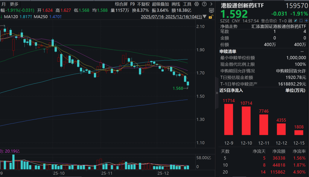 今日(12.16),港药再度回调,创新药纯度100%的港股通创新药ETF(159570)收跌近2%两连阴刷新阶段新低,全天成交额18.5亿元,环比增长24%!资金面上,近10日累计净流入超4.4亿元!截至12月15日,港股通创新药ETF(159570)最新规模超223亿元,同类持续领先!