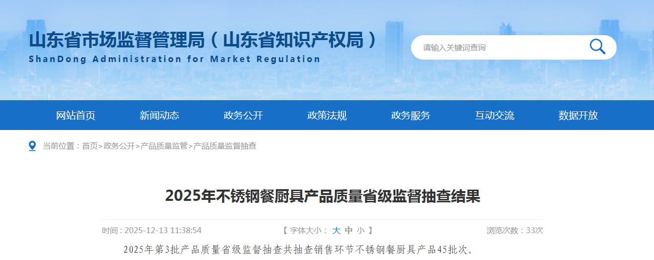 中国质量新闻网讯 据山东省市场监督管理局网站消息,近日,山东省市场监督管理局公布2025年不锈钢餐厨具产品质量省级监督抽查结果。2025年第3批产品质量省级监督抽查共抽查销售环节不锈钢餐厨具产品45批次。