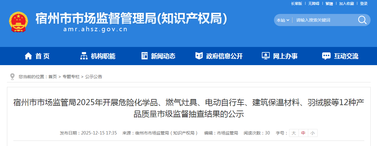 中国质量新闻网讯 据安徽省宿州市市场监管局网站消息,根据有关规定,2025年该局开展电动自行车、危险化学品、燃气灶具、建筑保温材料、羽绒服等12种产品质量市级监督抽查172批次产品,不合格1批次。抽检结果,现予以公示。