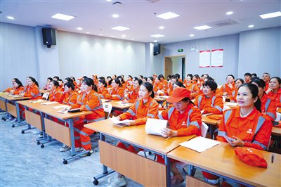 本报讯 “Good morning!”“Can I help you?”12月14日上午,海口市金滨路的龙华区职工活动中心二楼传来阵阵英语朗诵声,数十名身穿橙红色工作服的环卫工人端坐桌前,全神贯注地跟着老师大声朗读,他们大多是三四十岁的壮年人。“海南自贸港封关后,会迎来越来越多的外国游客。我们刚刚完成了第三期英语培训,三期共计约200人次一线环卫工人参与。”海口龙马环卫环境工程有限公司总经理黄彪表示,该公司紧跟海南自贸港建设步伐,创建“党建红+环卫橙+生态绿”模式,在投入更多智能化新设备的同时,大力推动英语培训和作业安全培训,努力实现硬实力和软实力双提升,以过硬的保障实力和崭新的精神姿态迎接海南自贸港封关。记者 王小武 文/图