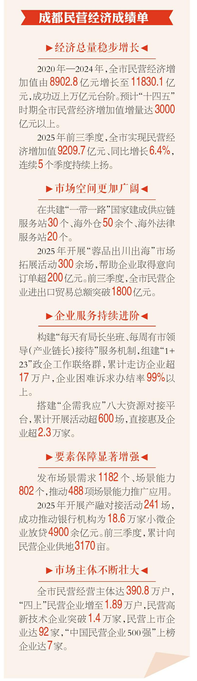 □文君 “十四五”时期,成都GDP成功迈过2万亿元台阶,长期处在全国GDP前十强城市第7的位置。如果要剖析成都经济发展的进阶之路,占比超过一半的民营经济是“主力军”与“活力源”。 这三个词,可以形容成都民营经济过去5年的表现—— 量级飞跃!“十四五”时期,成都民营经济增加值迈上万亿元台阶,增量预计超3000亿元。这不仅是数字的增长,更是成都经济生态一次质的升维,意味着“民营力量”已经成长为驱动这座城市向前的核心引擎之一。 活力“爆表”!目前,成都全市经营主体突破400万户,位列全国副省级城市第三。大约平均每5个成都人中,就有一个是“老板”。这片热土上,每天都在诞生新的可能,创业创新的密度与热度肉眼可见。 荣誉认证!“十四五”收官之年,主流媒体发布《2024—2025城市营商环境创新报告》,成都获评“营商环境年度创新城市”。它足以证明,成都在民营经济这片沃土耕耘得卓有成效。 这份漂亮的成绩单是怎么得来的?答案藏在企业家的感受里:是“有需必应”的快速响应,是“无事不扰”的贴心守护。成都用一套“组合拳”,真正让民营企业家站“C位”、当主角。以格局之变彰显民营经济分量之重 “56789”这组数据常被用来评价民营经济的贡献率。但在成都,这个数据早已变成更能体现民营经济重要性的“55999”,即成都市民营经济贡献了全市50%以上的GDP、50%以上的税收、90%以上的科技创新、90%以上的新增就业岗位、90%以上的经营主体。 这种贡献,源自民营经济体量的不断攀升。2024年,成都全市民营经济实现增加值11830.1亿元,是2020年8902.8亿元的1.33倍。 向前,继续向前!今年前三季度,成都全市民营经济持续上扬,实现民营经济增加值9209.7亿元、同比增长6.4%,总量占GDP比重达50.5%,较去年同期提升0.6个百分点。民营经济对GDP增长贡献率达到55.7%,高于去年同期8.4个百分点,成为全市经济增长的重要支撑。 内涵之变更耐人寻味。成都市发展和改革委员会负责人介绍,“十四五”期间,成都实施“优化提质、特色立园、赋能增效、企业满园”(以下简称“立园满园”)行动,明确十多条重点产业链发展重点、发展路径,推动民营经济从块状经济、小规模经营向链条协作、集群发展、规模经营转变。 在“立园满园”行动推动下,成都民营经济涌动无限活力。比如,位于成华区的成都机器人产业园,聚集起卡诺普、埃斯顿、成焊宝玛等机器人产业链企业116家,其中龙头企业12家,上下游产业链关联配套企业104家,民营经济“聚木成林”。 科技创新的星辰大海上,民营企业的“航船”同样劈波斩浪:成都国星宇航科技股份有限公司成功用“1箭12星”的方式,完成全球首个太空计算星座发射;把总部从深圳迁至成都的四川影目科技有限公司,最新一轮估值达20亿元;专注末端配送机器人赛道的成都越凡创新科技有限公司,在成都世园会等多场重要活动中大显身手…… 成都市发展和改革委员会有关负责人介绍,目前成都民营高新技术企业突破1.4万家,企业内生创新能力不断增强,科技实力逐步提升。以制度创新激活民营经济“一池春水” 民营经济格局之变,是企业创新求变、勇闯前沿的内生动力,与政府简政放权、筑渠引活水的主动作为,共同作用于“土壤”与“气候”的根本性改善——一个日益市场化、法治化、国际化的营商环境之上。 成都始终将营商环境建设作为推动高质量发展的关键支撑。去年11月,为从更高层面、更大范围内统筹全市力量,更好服务民营经济发展,成都从制度创新入手,成立了成都市民营经济发展促进中心(简称成都民促中心)并正式对外运营。 响应快,是不少与成都民促中心打过交道的企业给出的评价。成都迪立科技有限公司的核心产品是自动驾驶移动货柜。该公司总经理孙劭恒说,无人驾驶车辆要进入城市商业广场或景区,首先需解决合规问题,这曾让企业犯了难。了解到企业需求后,成都民促中心牵头,会同经信、城管、市场监管、商务、科技等多部门协同沟通,在半个月内帮助企业解决了投放准入问题。 不仅是响应快。聚焦民营企业全生命周期发展需求,成都民促中心突出开门开放、专题专业、高频高效,持续发挥“企需我应”八大资源对接平台效应,按照每周不低于10场活动频次开展资源对接,构建形成“场场有主题、天天有活动、周周见成效”的常态化服务格局。一年来,成都民促中心累计开展活动超600场,直接惠及企业超2.3万家。 场景的供给,成为成都优化营商环境的关键创新举措。今年以来,成都打造“场景创新·机会无限”活动品牌,在产业绿色转型、智慧城市建设等领域充分释放场景资源、发布场景清单,已累计发布场景需求1182个、场景能力802个,针对“三首”“三新”产品提供场景应用方案,推动超5000家企业实现产融对接、488项场景能力推广应用。 同时,针对成都民促中心平台收集到的民营企业面临的共性问题,成都先后出台“优化营商环境70条”“十大为企办实事”等民营经济发展支持举措,推动从解决单一问题向系统性优化、从事后回应向主动赋能的深刻转变,持续夯实民营经济高质量发展的制度根基。以“三个聚焦”实现民营经济“更上一层楼” 刚刚召开的成都市委十四届八次全会对“十五五”时期民营经济发展作出明确部署,提出要塑造“有需必应、无事不扰”营商环境品牌,推动“进解