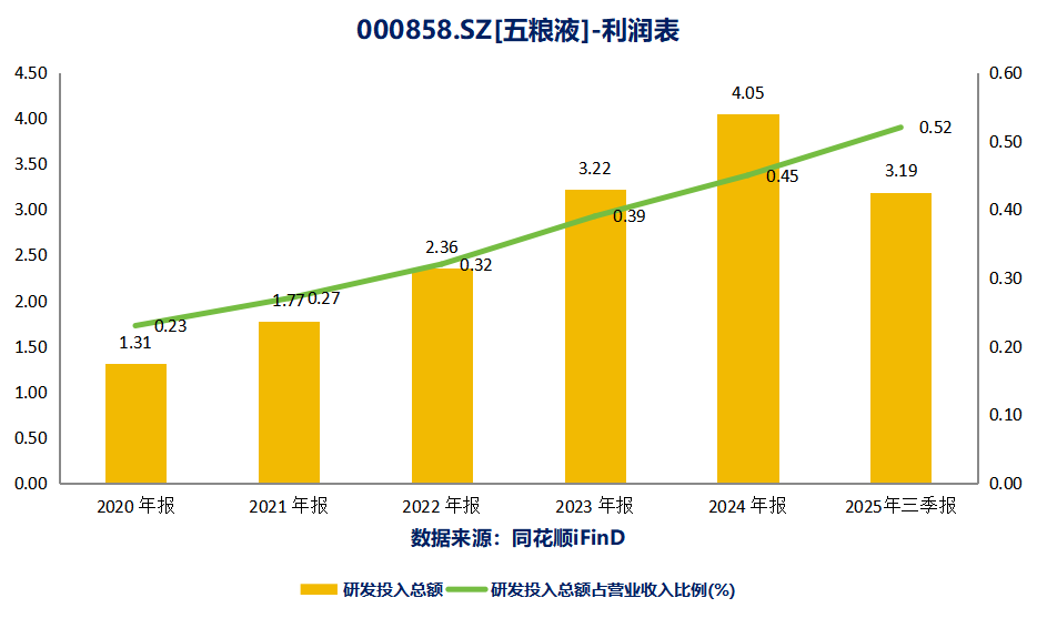 五粮液始终坚持品质为基、文化铸魂、守正创新,拥有白酒行业唯一的国家级国际联合研究中心,在坚守传统工艺的同时持续迭代升级,不断强化品牌核心竞争力,连续多年保持研发投入增长率>20%以上,由2020年的1.31亿元,持续增长至2024年度的4.05亿元,2025年三季度研发投入3.19亿元,无论是研发投入规模还是研发强度均领先白酒行业其他公司。也正是依托强大的创新投入和产出,五粮液保持着高品质的产品,品牌影响力持续提升。